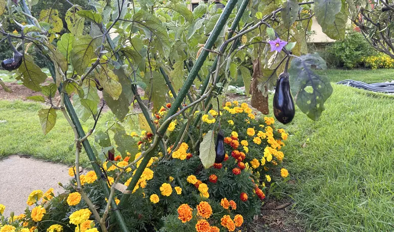 燦燦Villa内を歩くと、紫色が鮮やかなナスとカラフルなマリーゴールドが、はたけの土の上でまるで共演しているような姿が目に留まります。 この珍しい組合せに、宿泊されるゲストの多くの方が足を止められます。